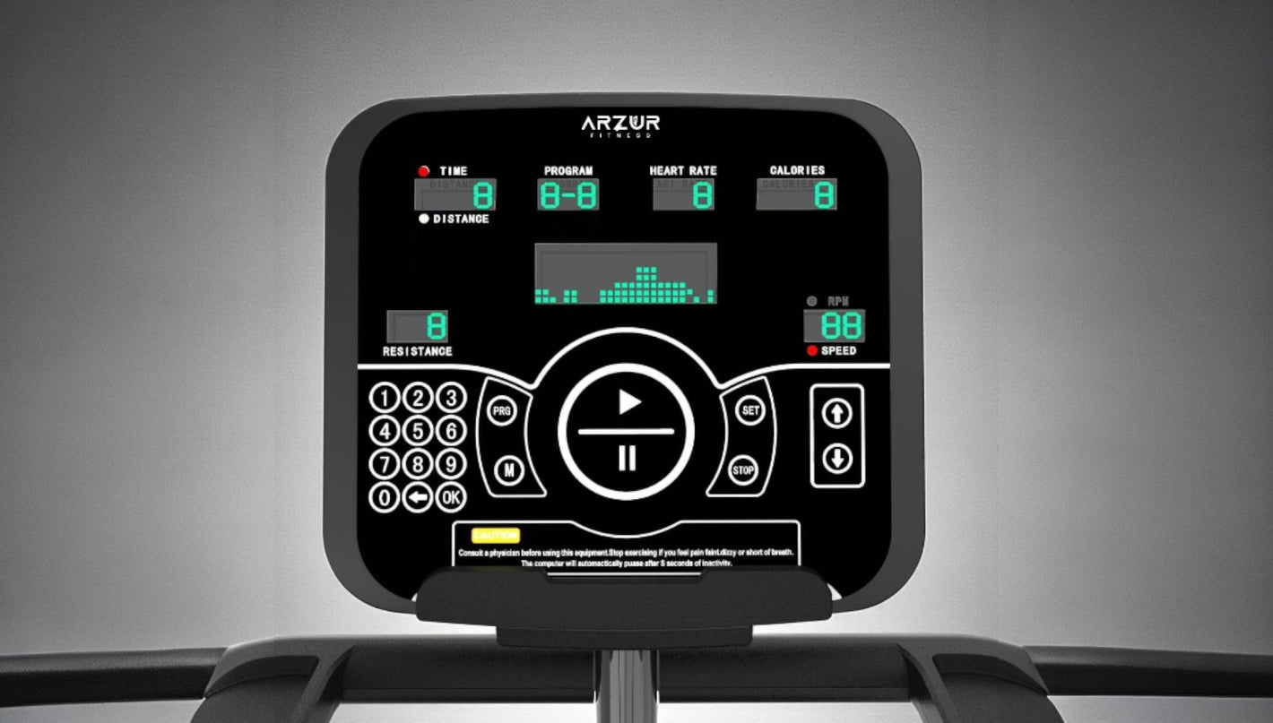 O painel conta com display digital multifuncional, projetado para oferecer dados completos durante o treino. Ele apresenta métricas de tempo, calorias, batimentos cardíacos, passos, subida vertical, nível de intensidade e velocidade, garantindo monitoramento preciso da performance. Possui programas automáticos, função USER para configuração personalizada, teste de gordura corporal (FAT) e teclas de ajuste rápido que facilitam a navegação e tornam o treino mais dinâmico. Com interface clara e comandos intuitivos, o painel oferece ao usuário uma experiência prática, segura e motivadora, ideal para quem busca resultados consistentes e de alto desempenho.