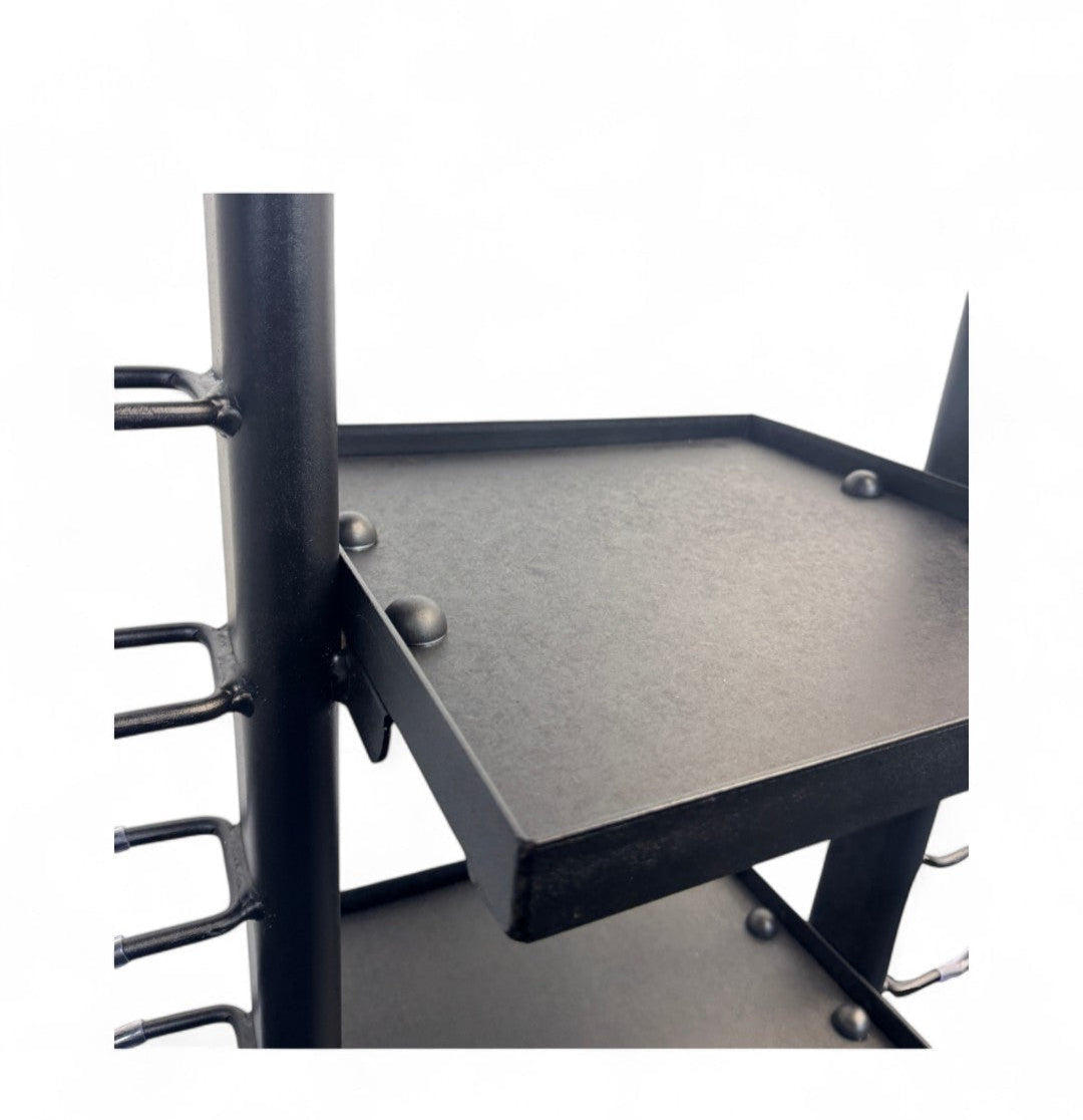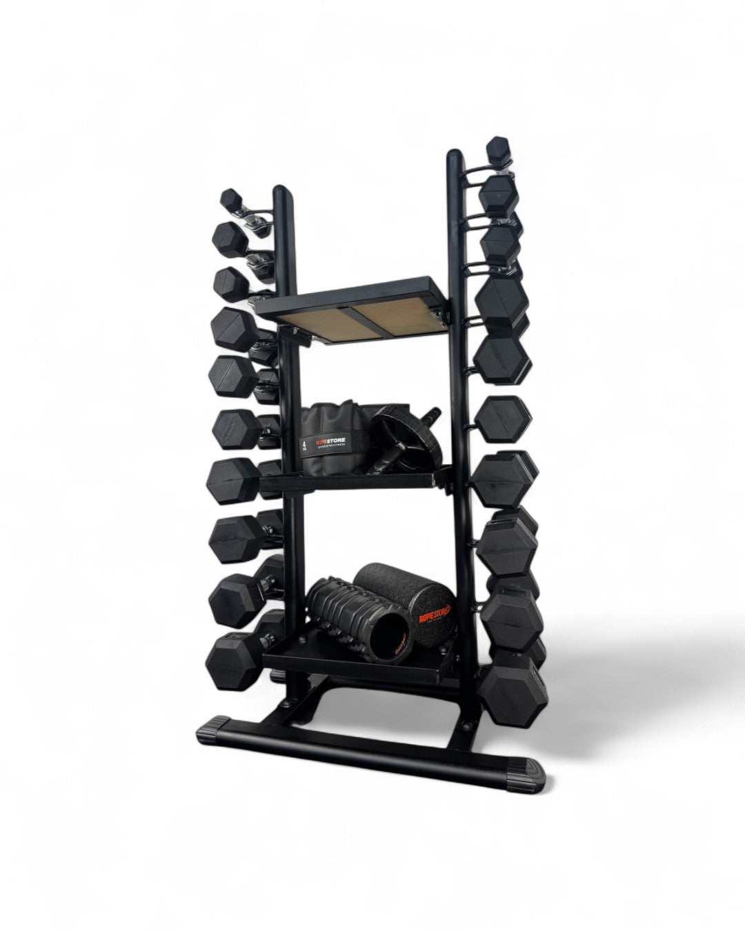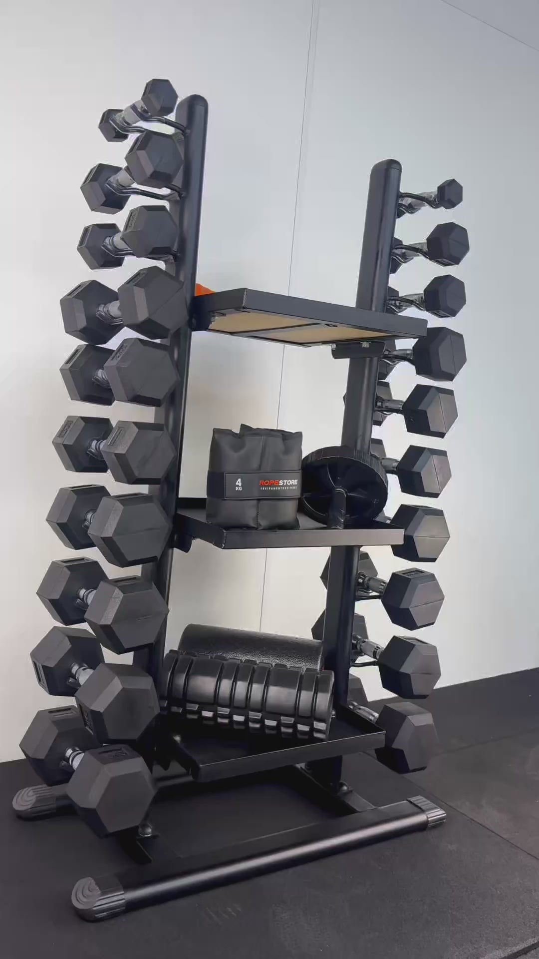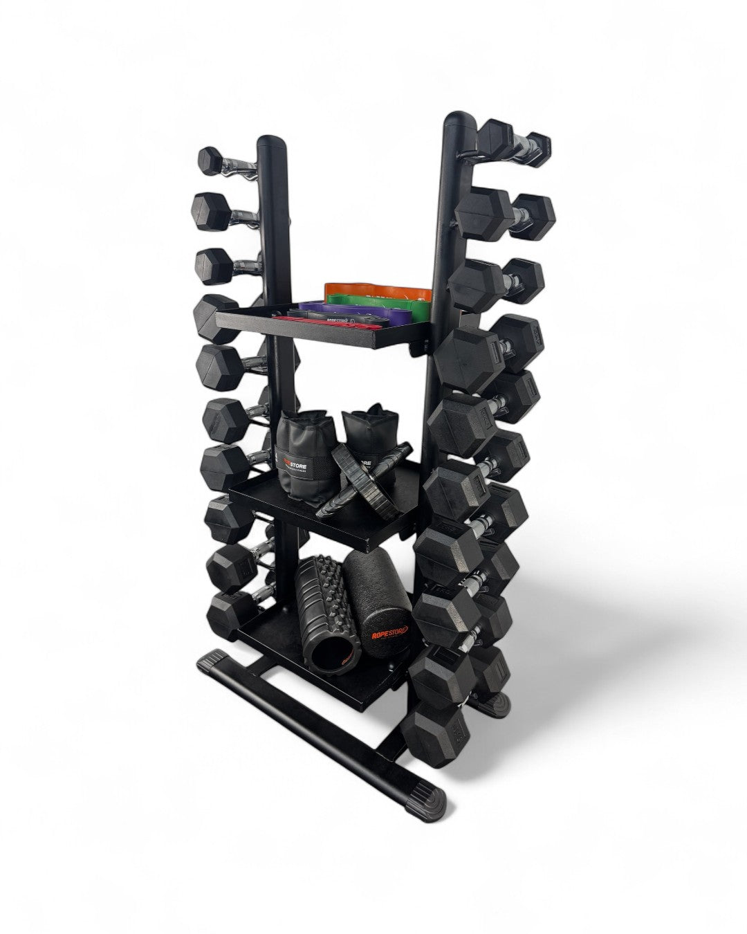 Solução ideal para quem busca eficiência e organização, seja em academias, estúdios ou no seu espaço de treino em casa. Com design vertical inteligente e prateleiras versáteis, acomoda halteres e acessórios de forma prática, garantindo segurança, otimização de espaço e uma apresentação profissional do seu ambiente.
