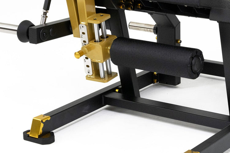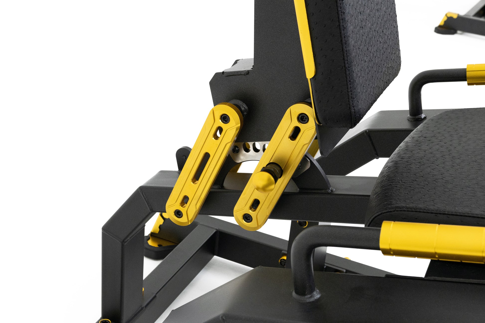 A regulagem de distância do apoio das pernas na extensora permite ajustar o alcance do movimento com total precisão, respeitando o comprimento da perna e a amplitude ideal para cada usuário.