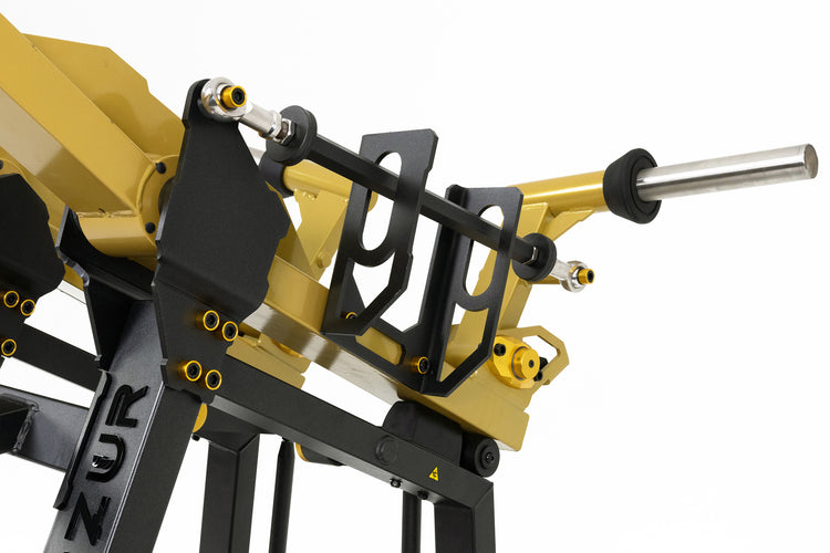 A Linha Robust não apenas suporta sua carga — ela responde a ela com inteligência. Os pistões estrategicamente posicionados garantem uma biomecânica fluida, silenciosa e extremamente confortável, mesmo sob cargas elevadas. Cada movimento é guiado com controle, evitando impactos desnecessários e maximizando a performance. Qual é a função dele? Durante a execução do exercício, o pistão promove o afastamento progressivo da anilha em relação ao eixo da máquina. Esse deslocamento gera uma tensão crescente ao longo do movimento. Assim, no ponto máximo de contração muscular, é justamente onde ocorre a maior tensão, potencializando o estímulo e a eficiência do exercício.”