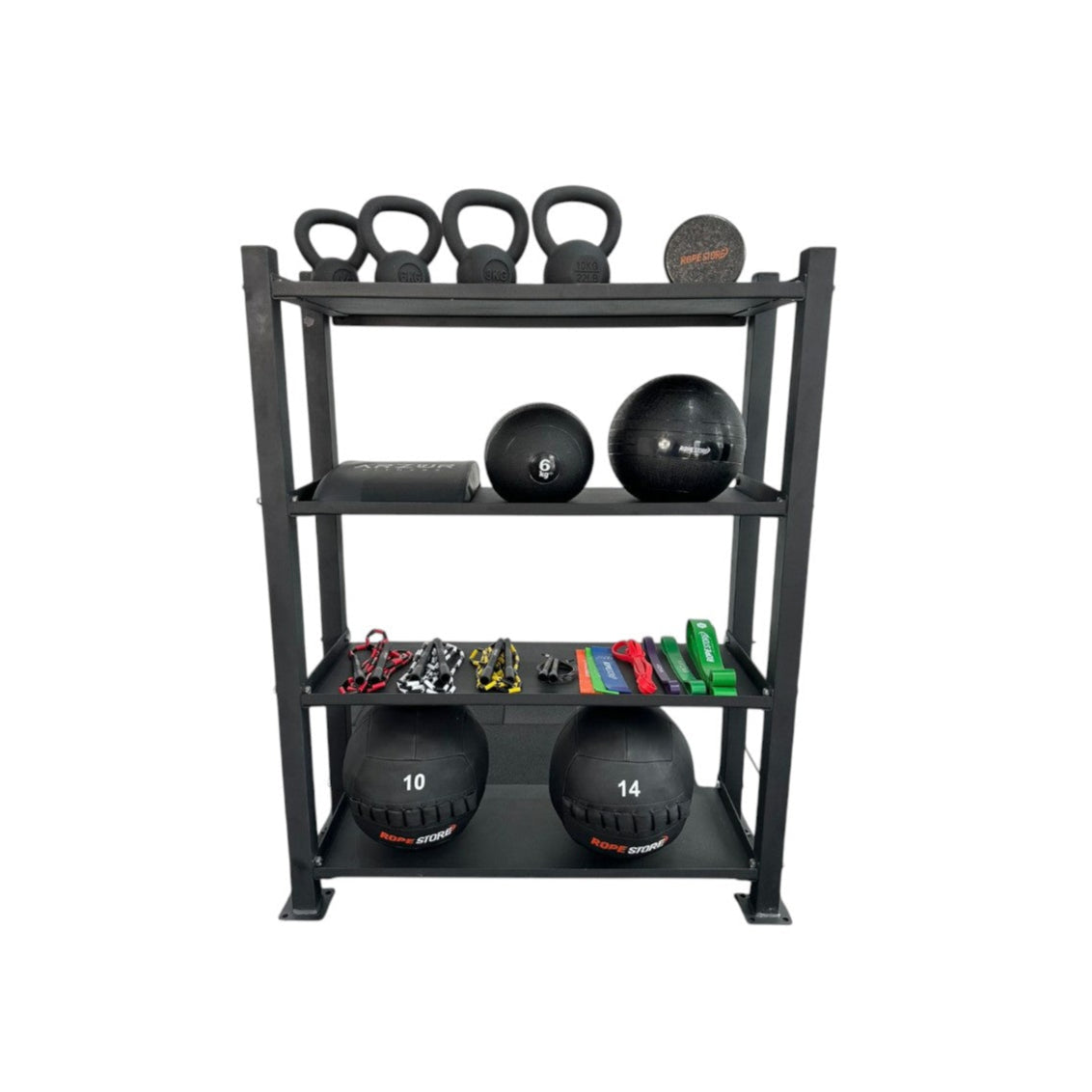 Além de ser uma opção prática para organizar seus materiais, o design compacto e eficiente do suporte permite que ele ocupe pouco espaço e maximize a área útil do seu treino, facilitando o acesso rápido aos itens armazenados. As prateleiras são espaçosas o suficiente para acomodar diferentes tipos de equipamentos, desde anilhas, cordas, pesos livres, até materiais menores, com a garantia de segurança e estabilidade.