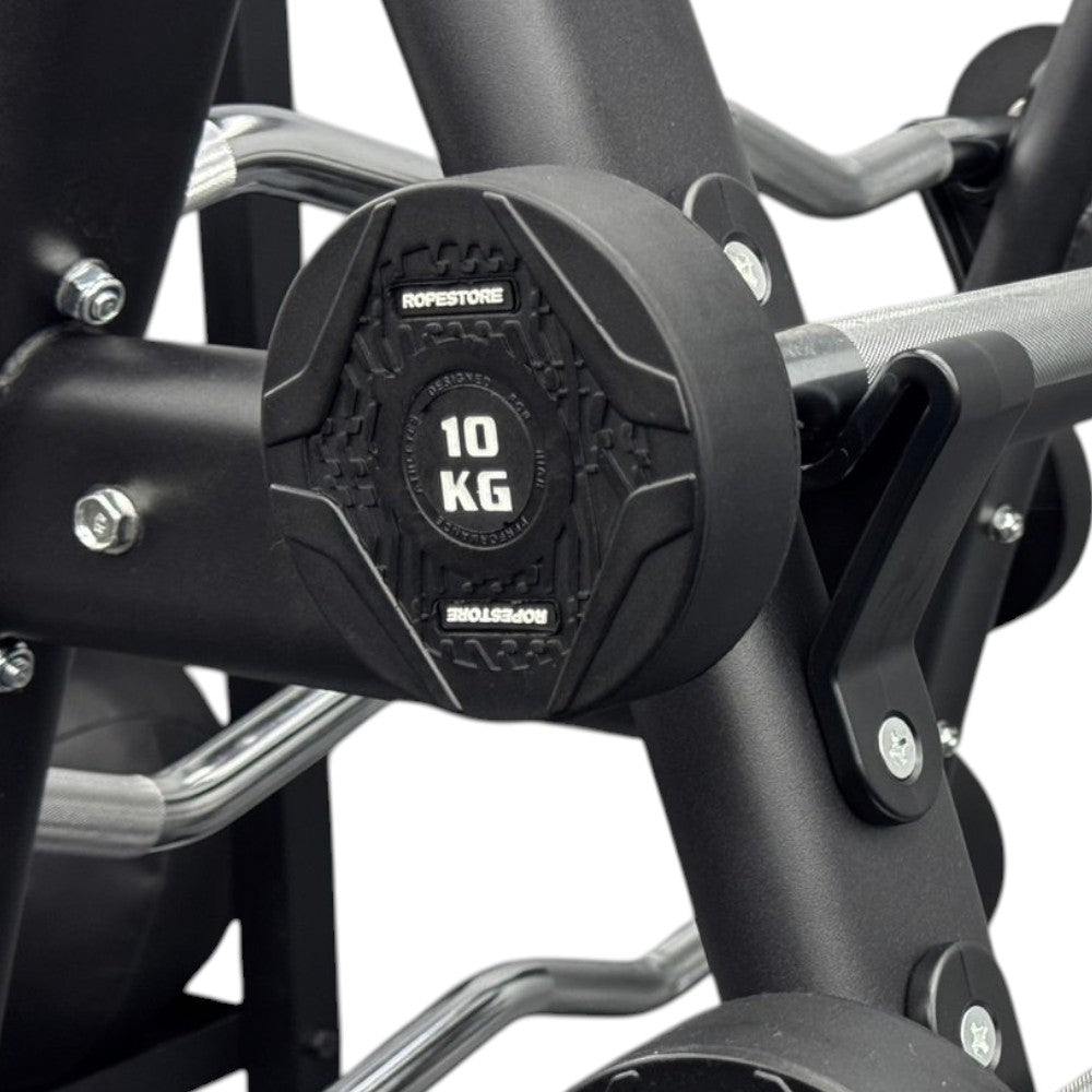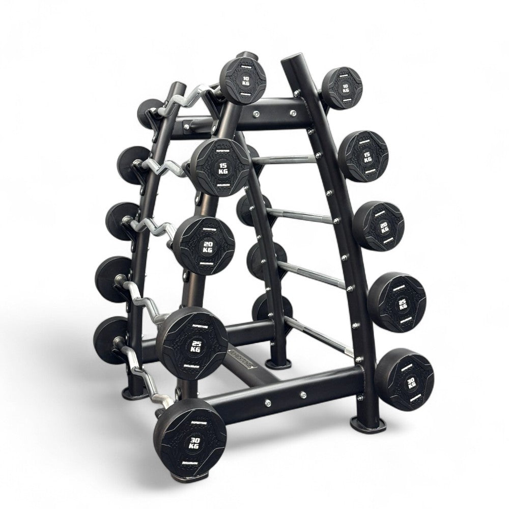 Barra W (EZ Bar): Projetada com curvatura ergonômica para reduzir a sobrecarga nos punhos e articulações durante movimentos como rosca direta, tríceps francês e remadas fechadas. Mais conforto, menor risco de lesão e maior controle.