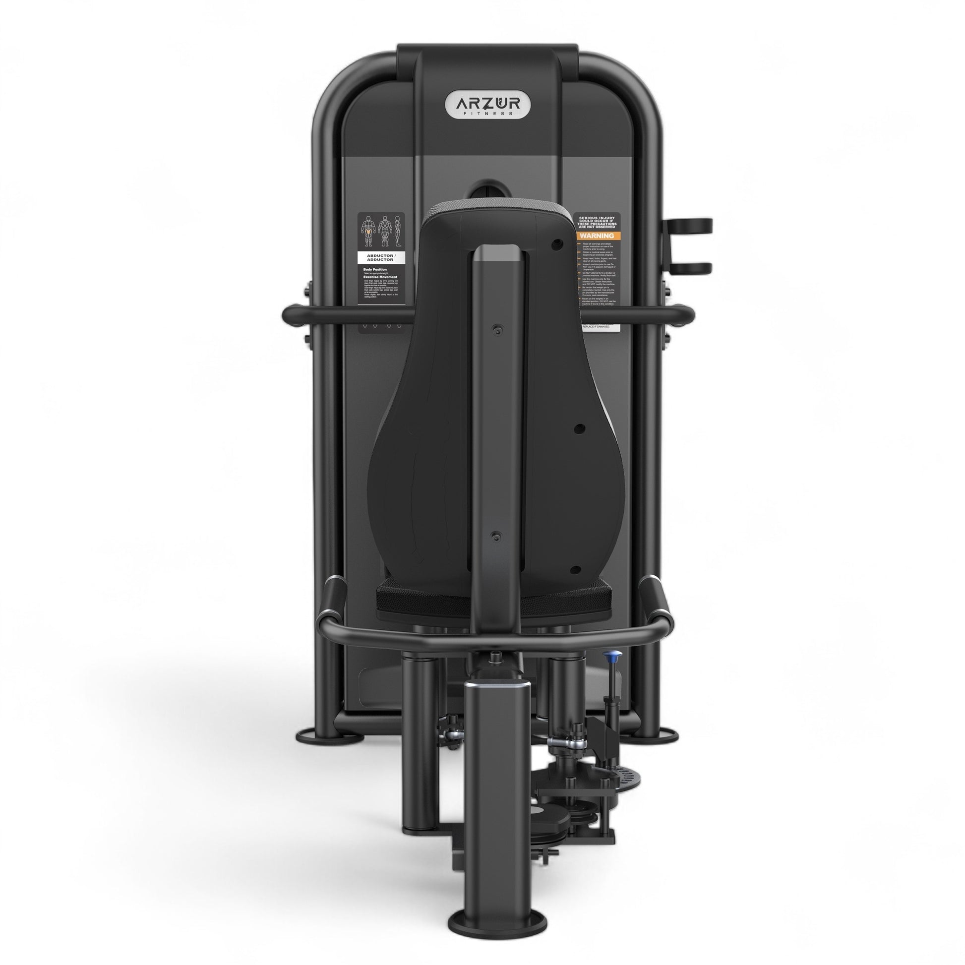 A Máquina Adutora e Abdutora Predator Arzur Fitness conta com uma torre de pesos em aço de alta resistência, desenvolvida para suportar uso intenso em academias profissionais.