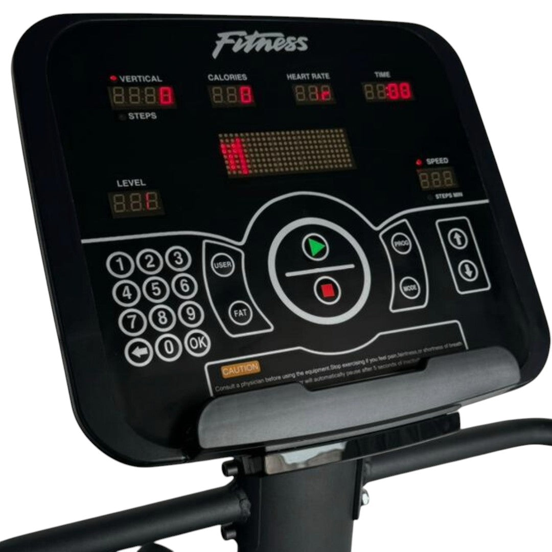 O painel conta com display digital multifuncional, projetado para oferecer dados completos durante o treino. Ele apresenta métricas de tempo, calorias, batimentos cardíacos, passos, subida vertical, nível de intensidade e velocidade, garantindo monitoramento preciso da performance. Possui programas automáticos, função USER para configuração personalizada, teste de gordura corporal (FAT) e teclas de ajuste rápido que facilitam a navegação e tornam o treino mais dinâmico. Com interface clara e comandos intuitivos, o painel oferece ao usuário uma experiência prática, segura e motivadora, ideal para quem busca resultados consistentes e de alto desempenho.